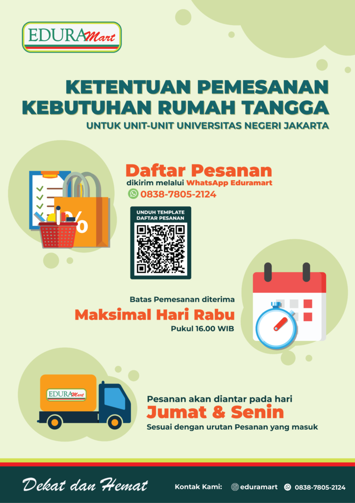 Dukung produktivitas unit kerja Anda di lingkungan Universitas Negeri Jakarta dengan layanan penyediaan kebutuhan rumah tangga yang cepat, dekat, dan hemat. Kami hadir untuk memastikan stok kebutuhan harian kantor Anda selalu terpenuhi tanpa perlu repot keluar kampus.
